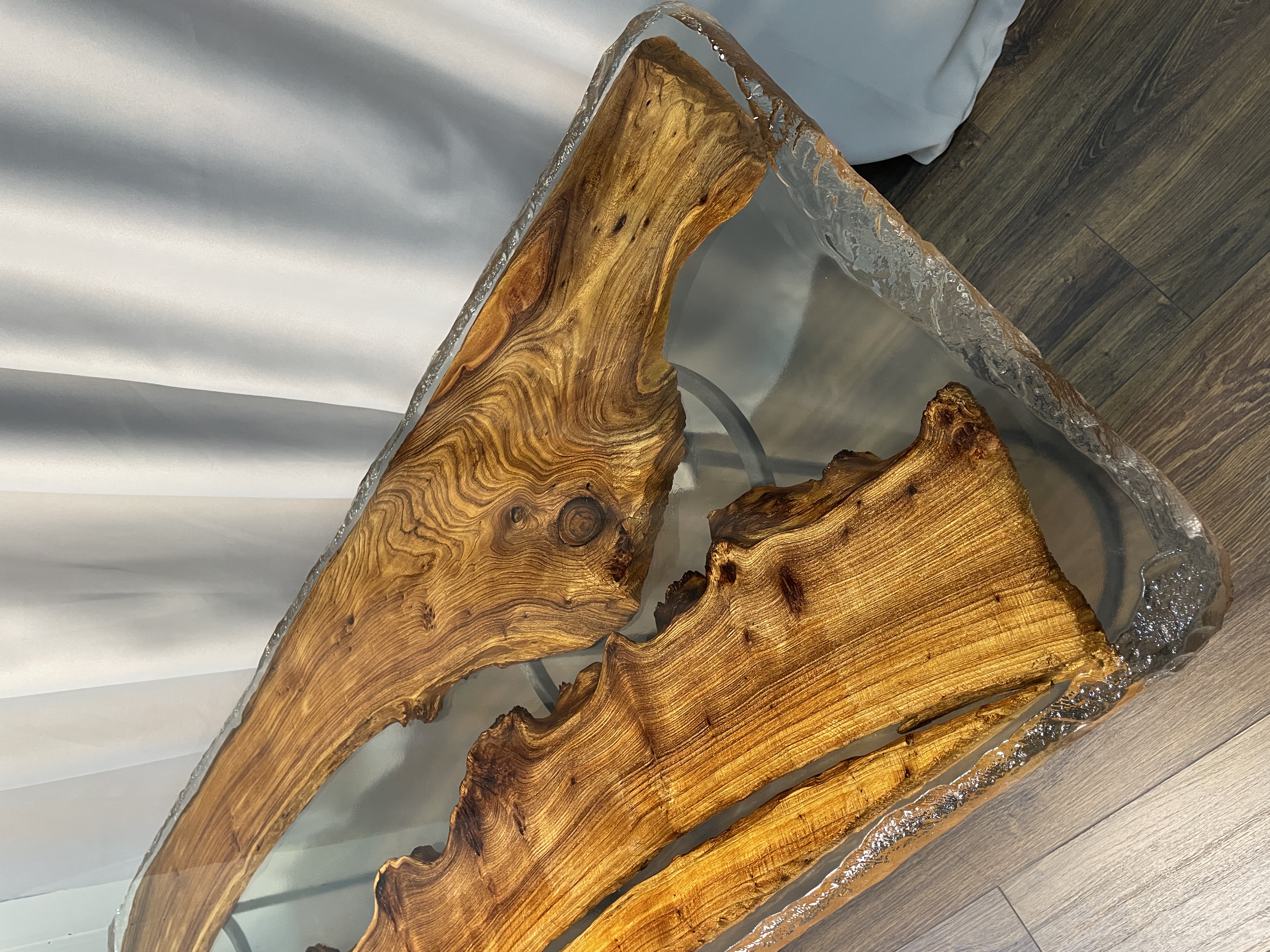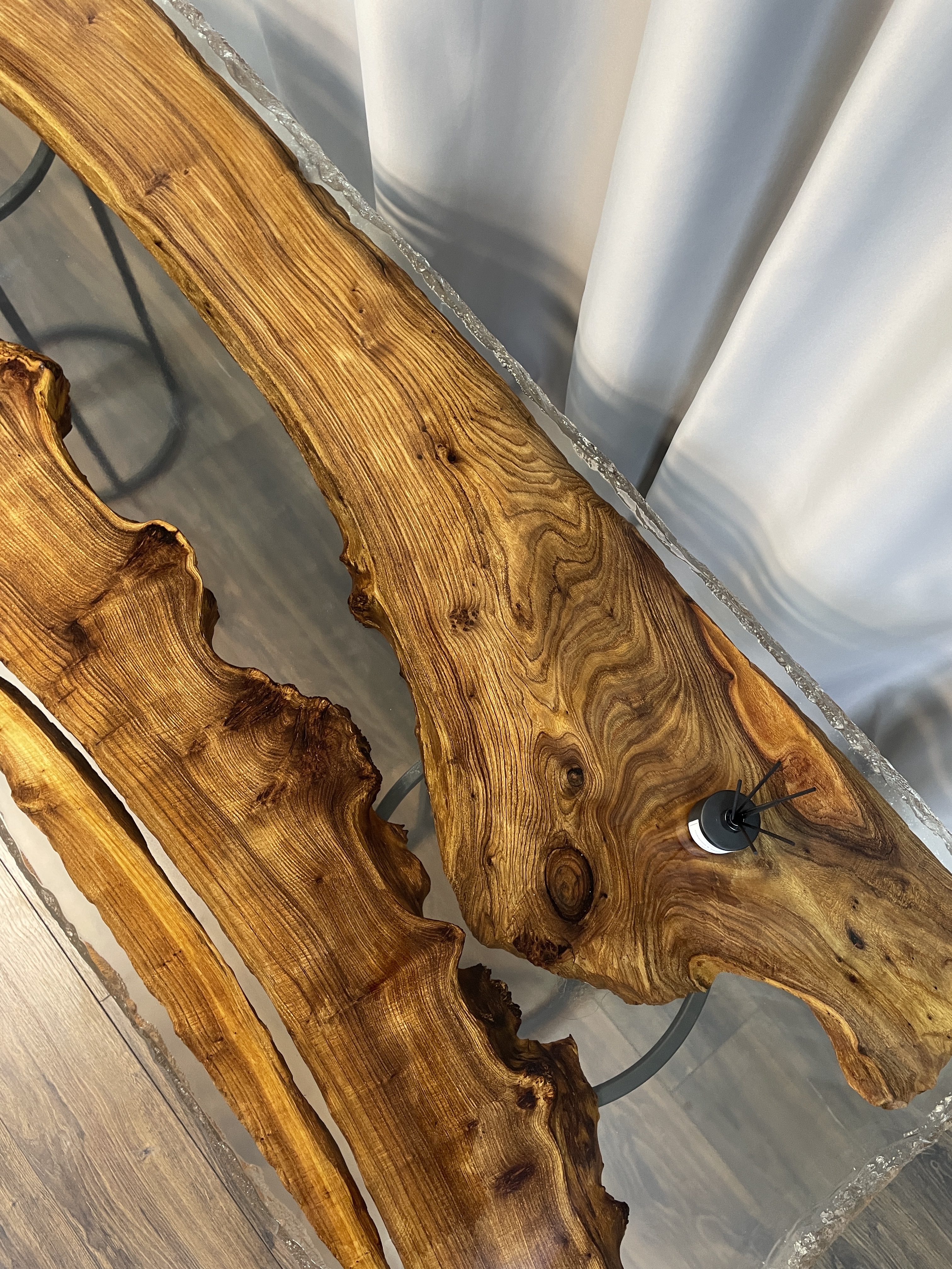 Древесина имеет выразительную, богатую текстуру с множеством сучков и волокон, что характерно для такой породы, как карагач. Цвет древесины — насыщенный, теплый, от светло-коричневого до янтарного оттенка. Центральная часть стола заполнена прозрачной эпоксидной смолой.